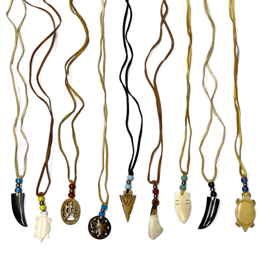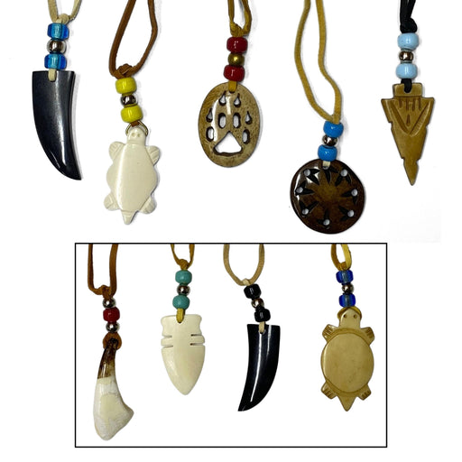4 Pack of Authentic Hand Carved Bone & Horn Necklace Pendants with Deerskin Lace - Native American Jewelry