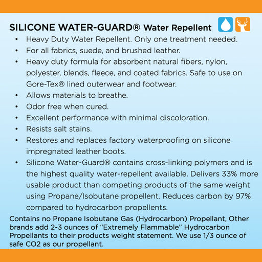 Heavy duty water repellent. Only one treatment needed. For all fabrics, suede, and brushed leather. Heavy duty formula for absorbent natural fiber...