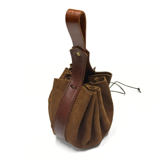 This Brown Suede Drawstring Bag combines medieval style with modern convenience. Measuring 13.75" in length, it features a black cord closure and a...