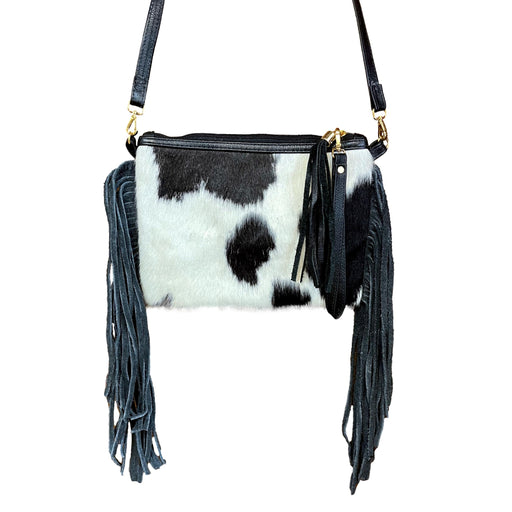 Introducing our newest Hair-On Cowhide Clutch, styled with suede fringe and removable straps! Crafted from genuine cowhide, this versatile and tren...