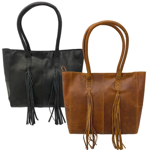 Leather Tote with Tassels - Black - Tan