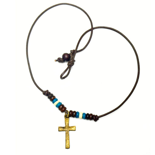 These handcrafted leather necklaces feature a striking combination of brown, blue, and white bone beads, highlighted by a distinctive cross pendant...
