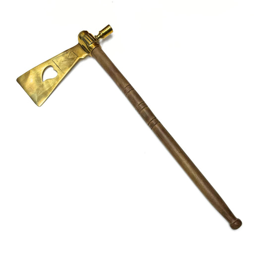 This authentic reproduction of an old engraved brass pipe axe features a heart piercing, iron insert bit and engraved designs, with a nicely finish...