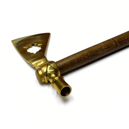 This beautiful, all brass, polished tomahawk smoking pipe is completely assembled and ready for smoking. Approximate size: 8" long