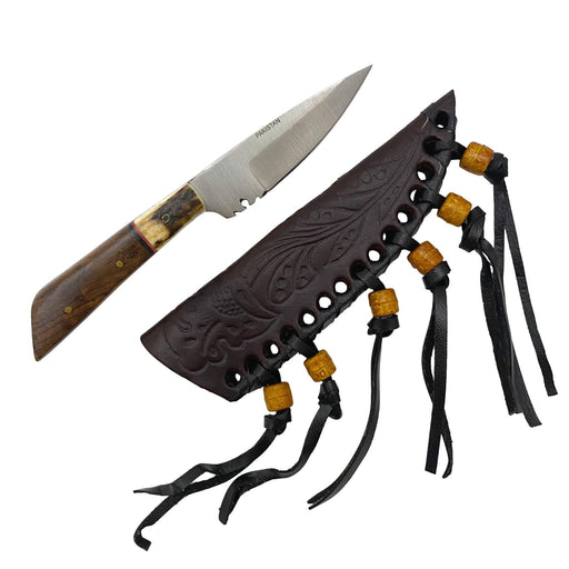 This Stag Wood Patch Knife features a full tang 5.75" stainless steel blade and a 3" antler and wood handle, securely fastened with brass pins. The...